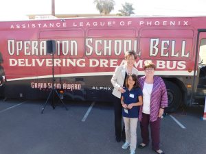 Throughout the school year, Kindergarten through 8th grade schoolchildren are either bussed to Assistance League of Phoenix’s Philanthropic Center; or the Delivering Dreams Bus, a mobile dressing center commissioned four years ago, heads to the individual schools. Students have an opportunity to “go shopping” with a volunteer, selecting their uniform and other personal items. While waiting for their turn, students work on crafts, read a book, or play a board or computer game.
