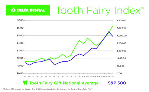 Just in time for Tooth Fairy Day on February 28, Delta Dental of Arizona released its 2023 Original Tooth Fairy Poll®, and in it reports that the average value of a single lost tooth during the past year increased 16% from $5.36 to $6.23. The new value not only has children beaming with gap-toothed smiles but also represents a record high in the 25-year history of the poll. Since the poll’s inception, the average cash gift left by the Tooth Fairy has surged 379% from $1.30 to $6.23 per tooth. At this rate, in 2048, the Tooth Fairy would be leaving a whopping $30 under the pillow for a single tooth.