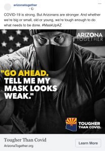 (PHOENIX, July 24, 2020) — Governor Doug Ducey yesterday announced a statewide campaign developed in partnership with Arizona advertising and public relations firms to promote the use of masks and other important precautions to contain the spread of COVID-19. This first-of-its-kind collaboration will feature creative concepts in English and Spanish developed by Arizona’s leaders in advertising supported by $3 million from the Governor’s Office for distribution across media platforms statewide.