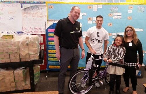 (PHOENIX – Dec. 18, 2015) – Subway Kids & Sports of Arizona, in partnership with Subway Restaurants of Arizona, Dasani Water, Shamrock Farms and The Be Kind People Project, rode into Griffith Elementary School in Phoenix this December to recognize two special students as part its Cycle for Success program. Through a teacher-led nomination process, wherein educators are asked to submit nominations highlighting students’ good works both inside and outside of the classroom, 2nd grader Serena and 4th grader Jose were chosen to be surprised with bikes, helmets and locks, as well as Subway lunches for their entire classes.
